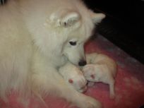 Bailey bliver ikke længere brugt i avl, her er hun med to af hendes elskede små hvalpe